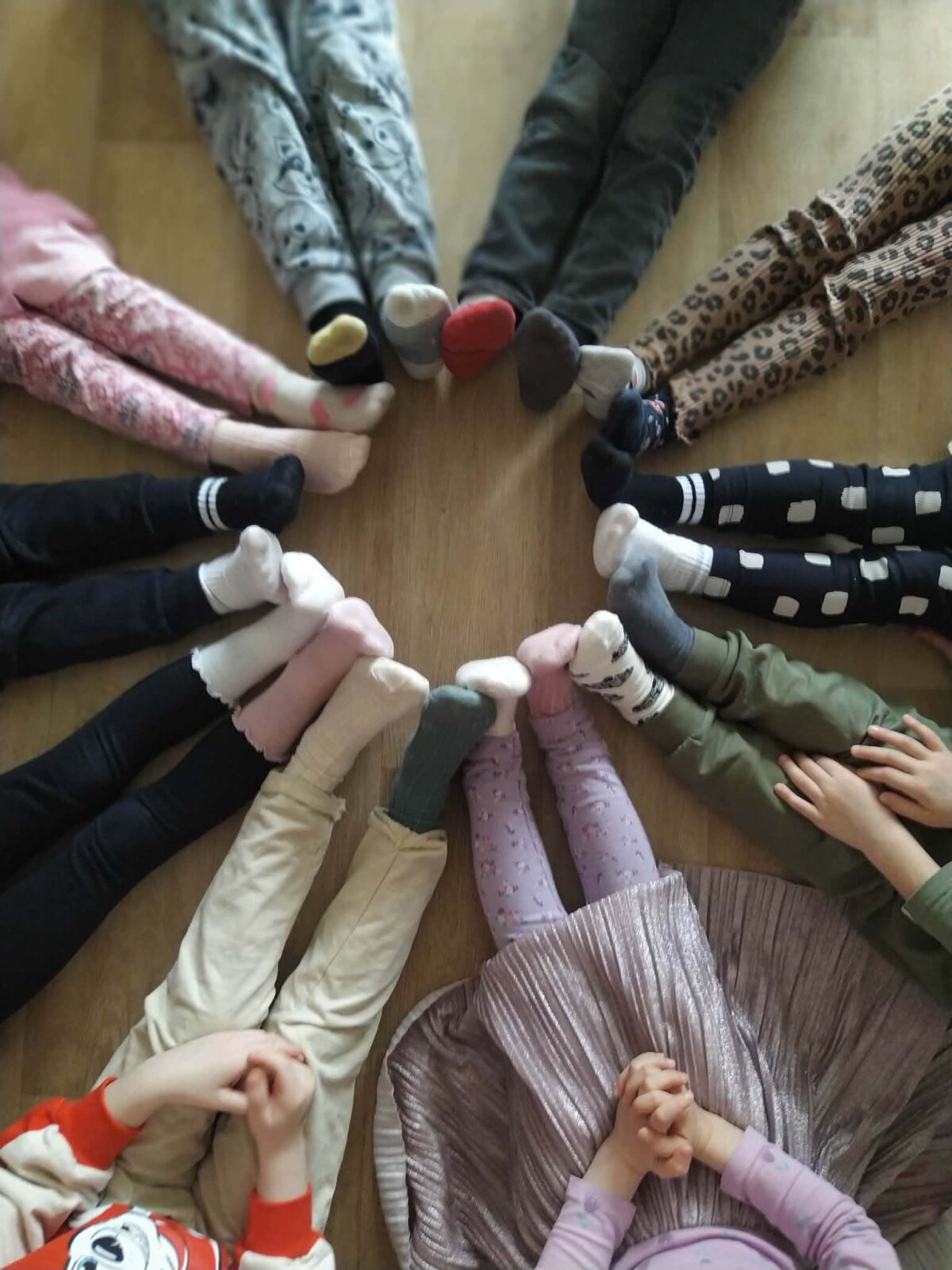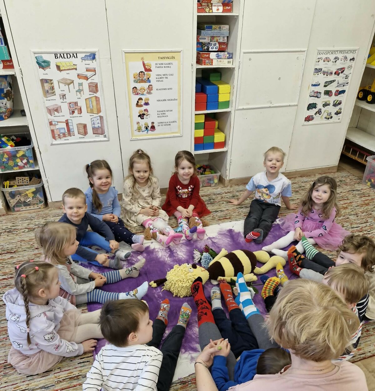 Veiklų metu vaikai susibūrė į bendrą ratą, bendravo, stebėjo vieni kitų kojines, dalijosi įspūdžiais, žaidė ir kalbėjosi apie tai, kaip svarbu priimti kitą tokį, koks jis yra. Per paprastas, tačiau prasmingas veiklas buvo stiprinamas vaikų empatijos, bendrystės ir pagarbos kitam žmogui jausmas.
