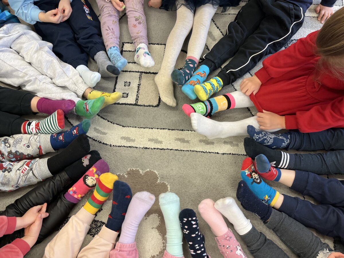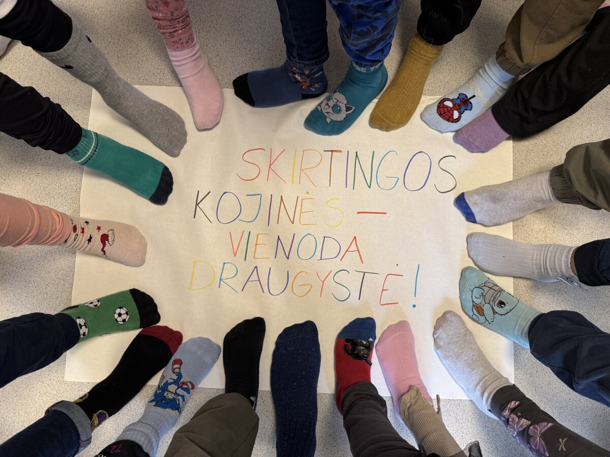 Prisijungdami prie iniciatyvos „Skirtingos kojinės“, vaikai ir mokytojai pasipuošė spalvingomis, skirtingomis kojinėmis, kurios simboliškai primena, jog visi žmonės yra unikalūs ir ypatingi.