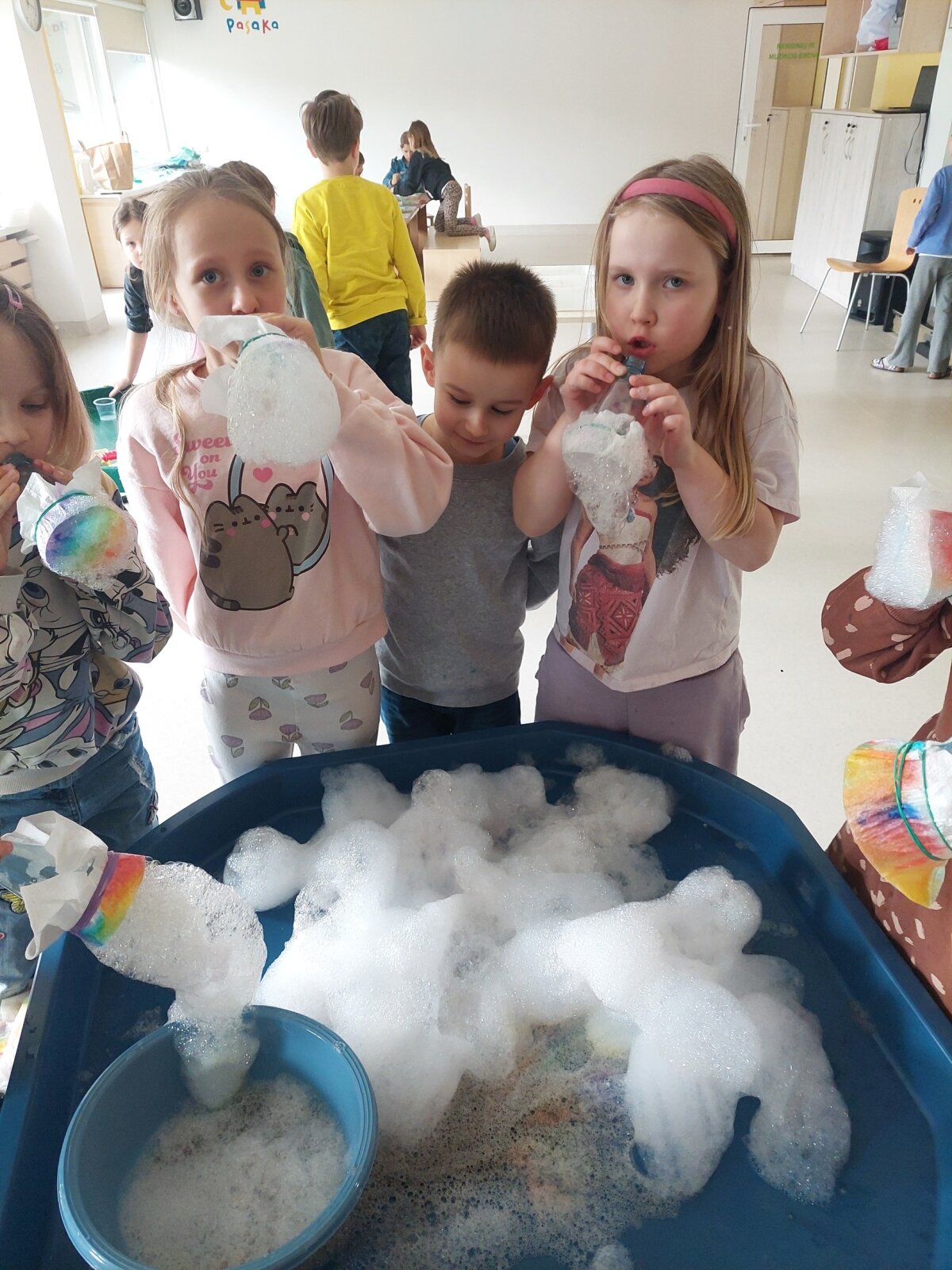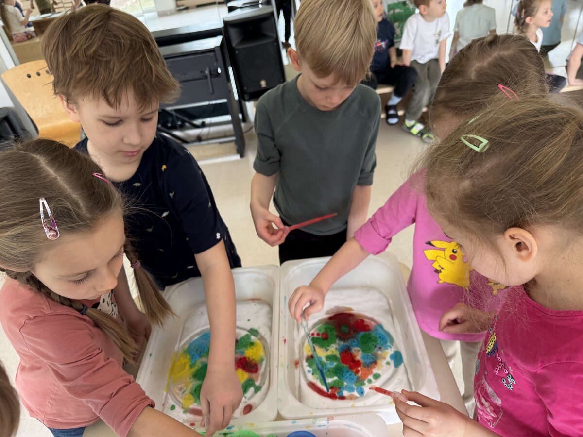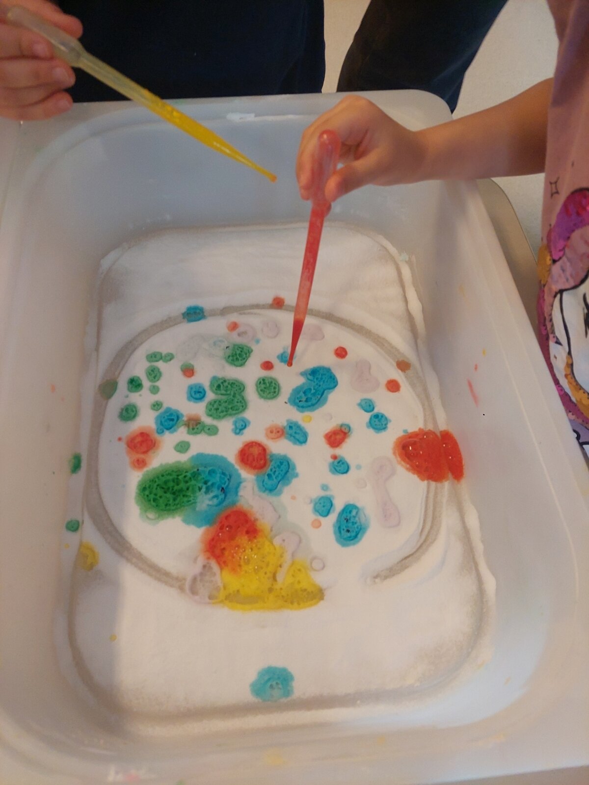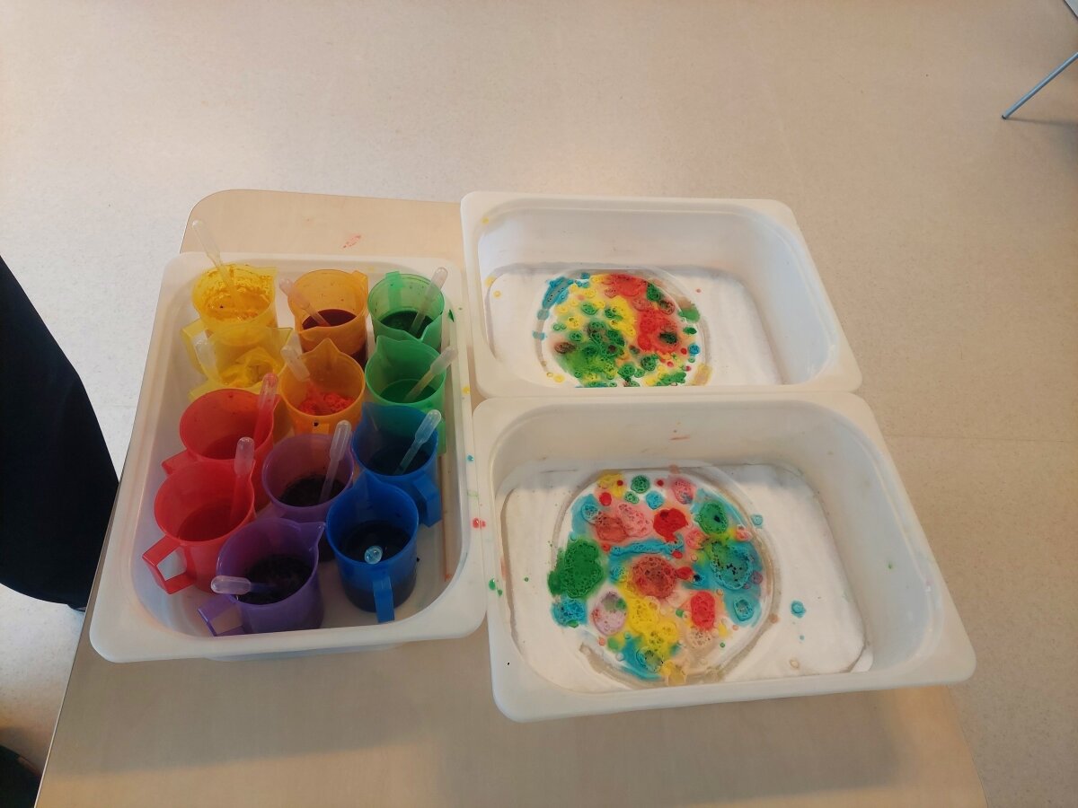 Edukacinės veiklos metu buvo parengtos aštuonios skirtingos erdvės, skirtos įvairiems eksperimentams ir tyrinėjimams. Pirmojoje erdvėje vaikai turėjo galimybę išbandyti piešimą naudojant sodą ir actą. Ši veikla sukėlė didelį susidomėjimą ir paliko stiprų emocinį įspūdį dėl netikėto ir vizualiai patrauklaus cheminės reakcijos rezultato.