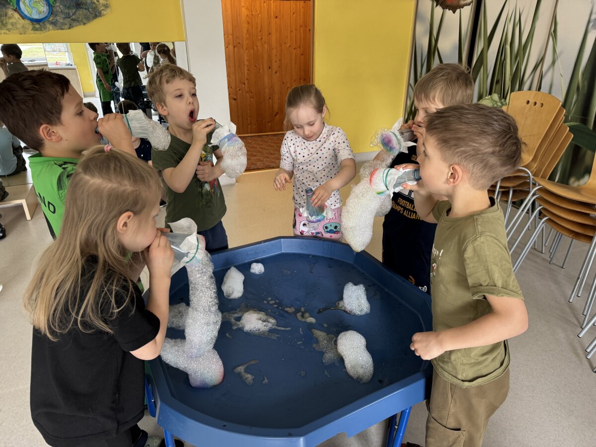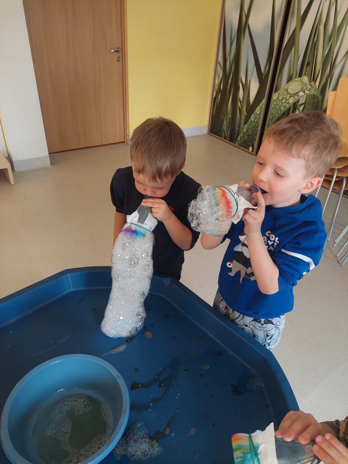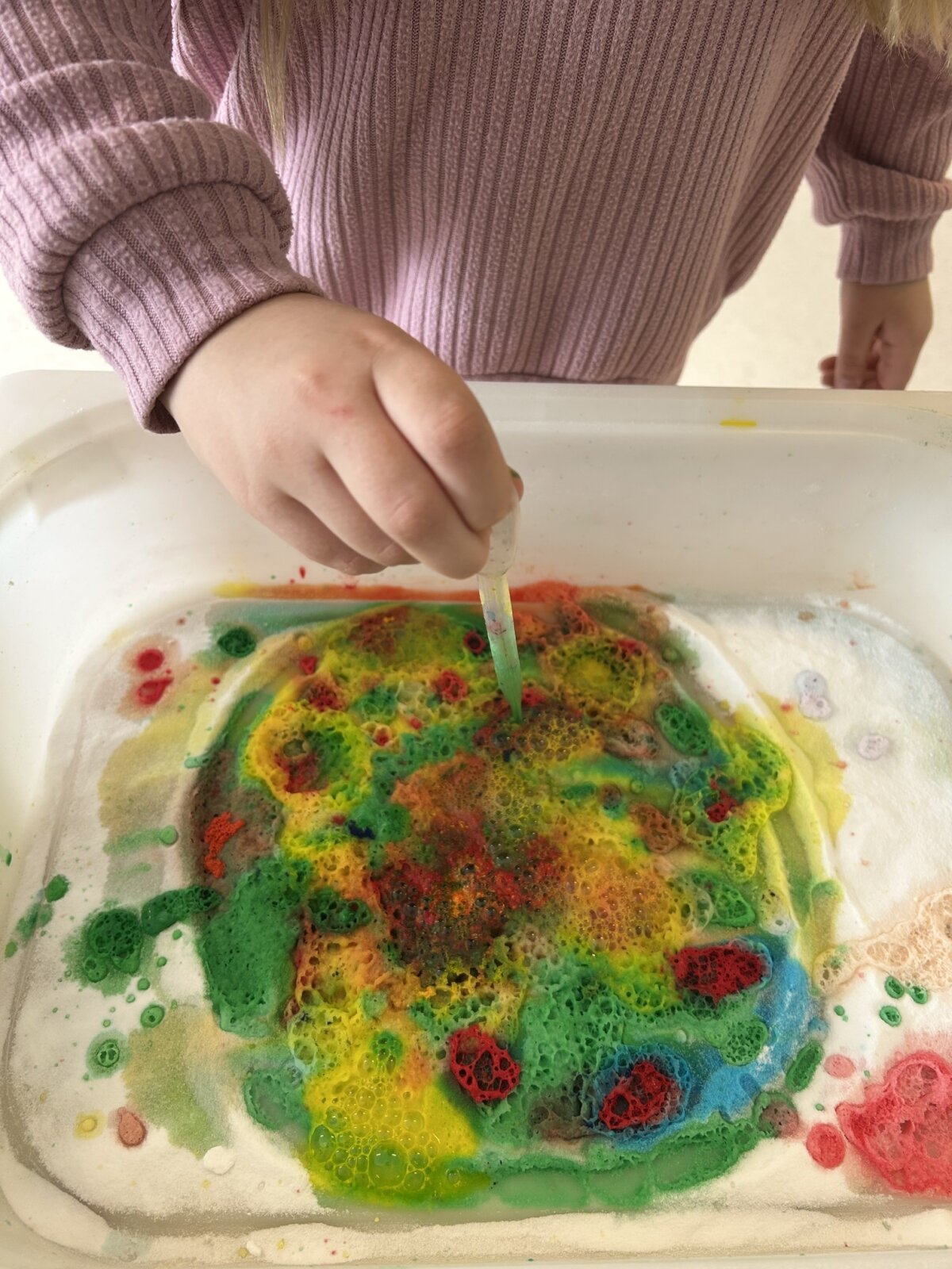 Edukacinės veiklos metu buvo parengtos aštuonios skirtingos erdvės, skirtos įvairiems eksperimentams ir tyrinėjimams. Pirmojoje erdvėje vaikai turėjo galimybę išbandyti piešimą naudojant sodą ir actą. Ši veikla sukėlė didelį susidomėjimą ir paliko stiprų emocinį įspūdį dėl netikėto ir vizualiai patrauklaus cheminės reakcijos rezultato.