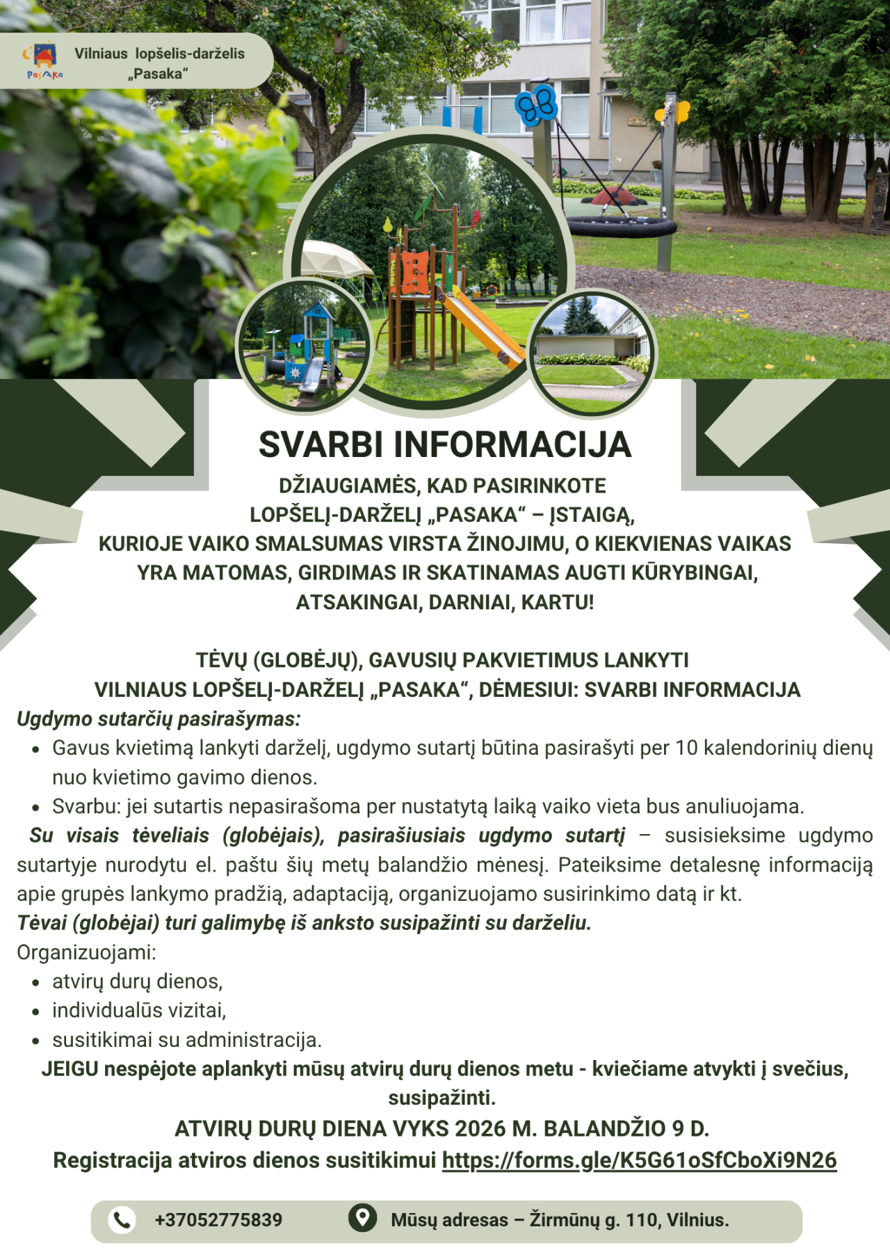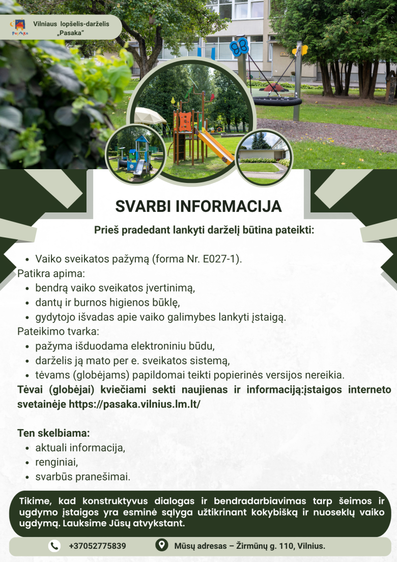 INFORMACIJA TĖVAMS (GLOBĖJAMS), SUDARIUSIEMS AR NORINTIEMS SUDARYTI SUTARTĮ SU LOPŠELIU-DARŽELIU „PASAKA“